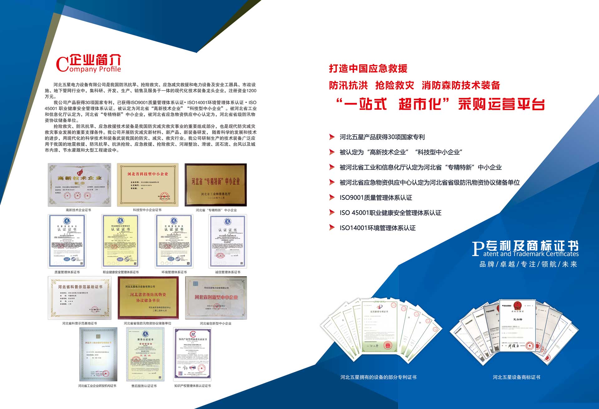 河北五星電力設(shè)備有限公司是我國(guó)防汛抗旱、搶險(xiǎn)救災(zāi)、應(yīng)急減災(zāi)救援和電力設(shè)備及安全工器具、市政設(shè)施、地下管網(wǎng)行業(yè)中,集科研、開發(fā)、生產(chǎn)、銷售及服務(wù)于一體的現(xiàn)代化技術(shù)裝備高新技術(shù)企業(yè),注冊(cè)資金1200萬元?! ∥夜井a(chǎn)品已獲得ISO9001質(zhì)量管理體系...